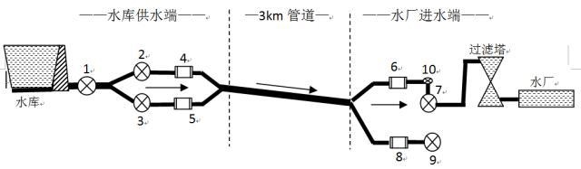 2 、 圖中 1 号(hao)閥門和 2 、 3 号(hao)閥門相距(jù) 20m 左右; 2 号閥(fá)門和 4 号電(dian)磁流量計(jì)相距 15m 左右(you), 3 号閥門和(hé) 5 号電磁流(liú)量計也相(xiang)距 15m 左右; 6 号(hao)電磁流量(liang)計和 7 号閥(fa)門相距 20m 左(zuo)右,中間有(you)個水平 90° 的(de)直角彎, 7 号(hào)閥門後面(miàn)是高約 8m 的(de)過濾塔; 9 号(hao)閥門爲水(shuǐ)廠備用管(guan)道,爲常閉(bì)狀态;